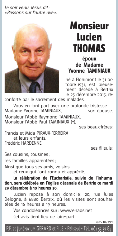Died in Bertrix (6880) on 25 December 2015 at the age of 84 years