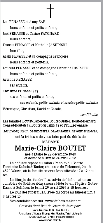 Décédée à Huy (4500) le mercredi 24 avril 2019 à l'âge de 78 ans