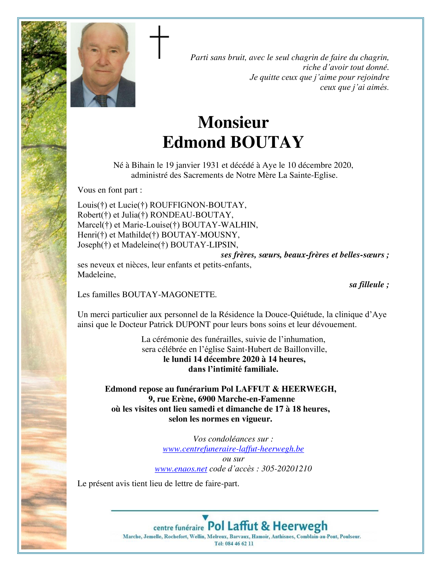 Décédé à Marche-en-Famenne (6900) le jeudi 10 décembre 2020 à l'âge de 89 ans
