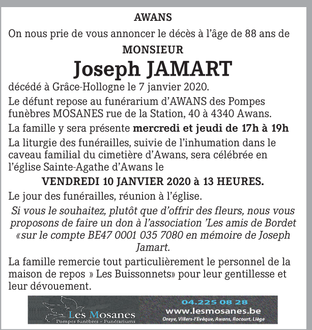 Fallecido en Grâce-Hollogne (4460) el martes, 7 de enero de 2020 a la edad de 88 años