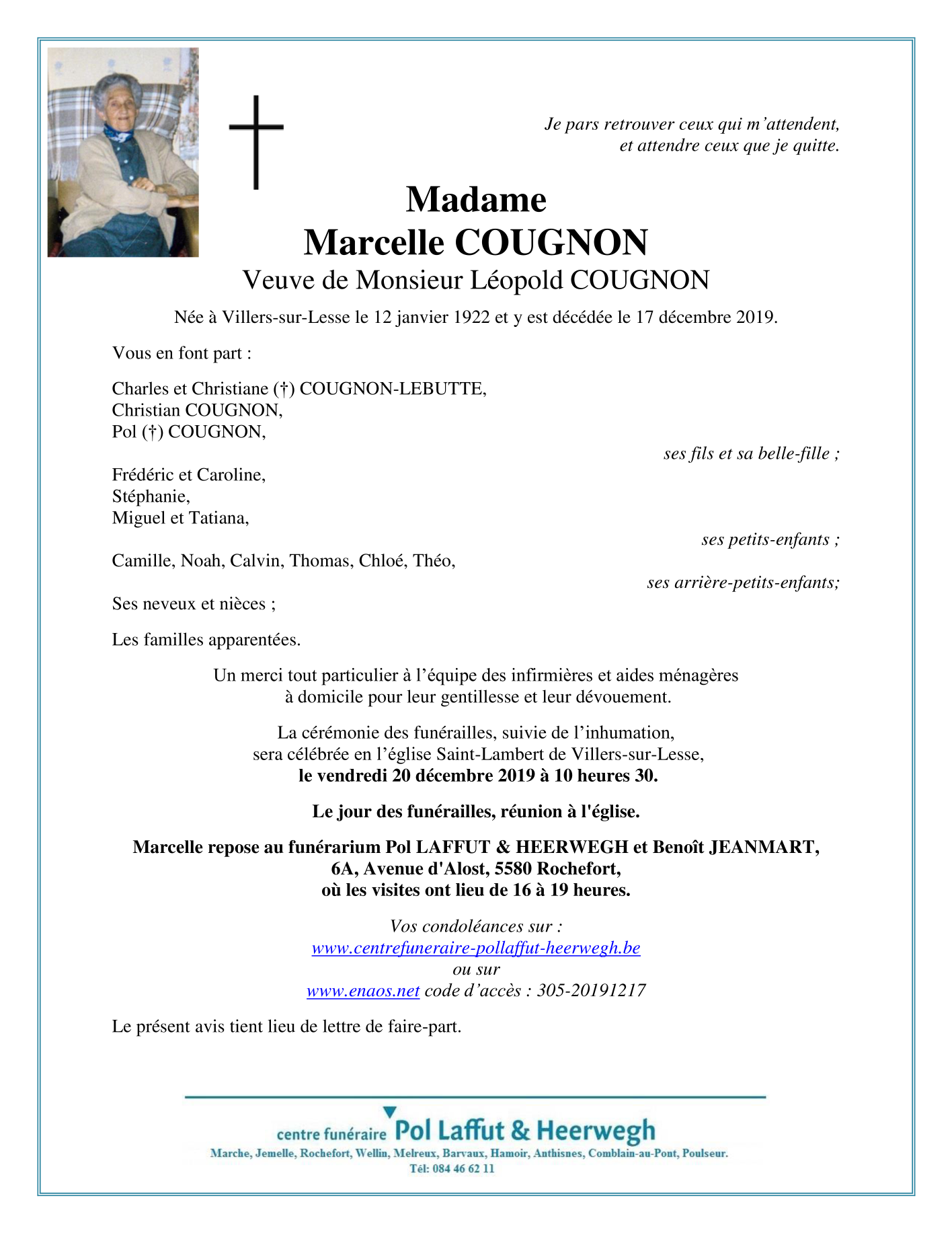 Décédée à Villers-sur-Lesse (5580) le mardi 17 décembre 2019 à l'âge de 97 ans