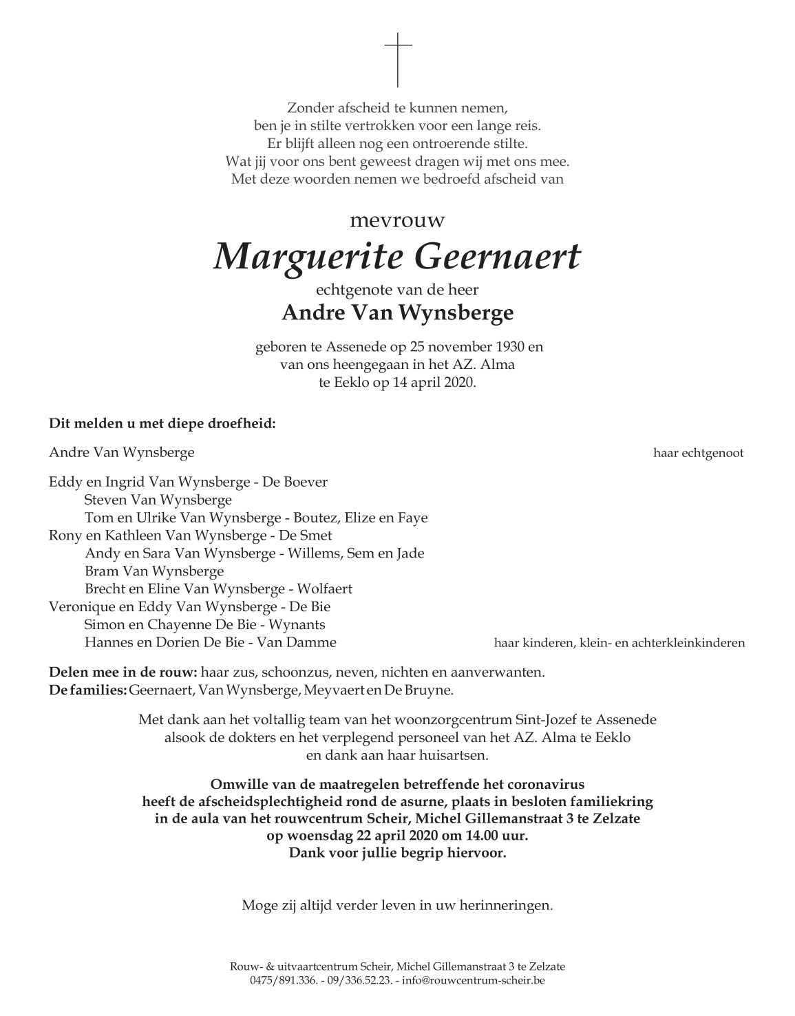 Décédée à Eeklo (9900) le mardi 14 avril 2020 à l'âge de 89 ans