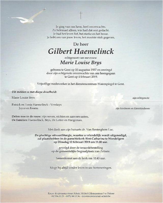 Décédé à Wondelgem (9032) le lundi 4 février 2019 à l'âge de 81 ans