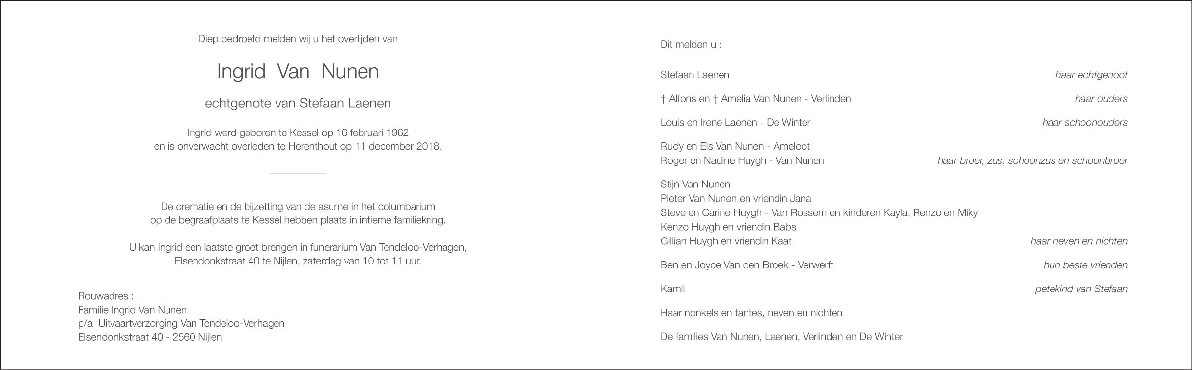 Décédée à Herenthout (2270) le mardi 11 décembre 2018 à l'âge de 56 ans