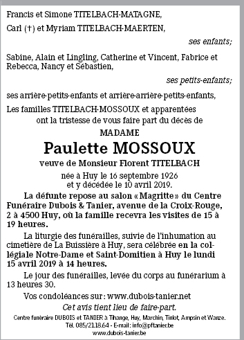 Décédée à Huy (4500) le mercredi 10 avril 2019 à l'âge de 92 ans