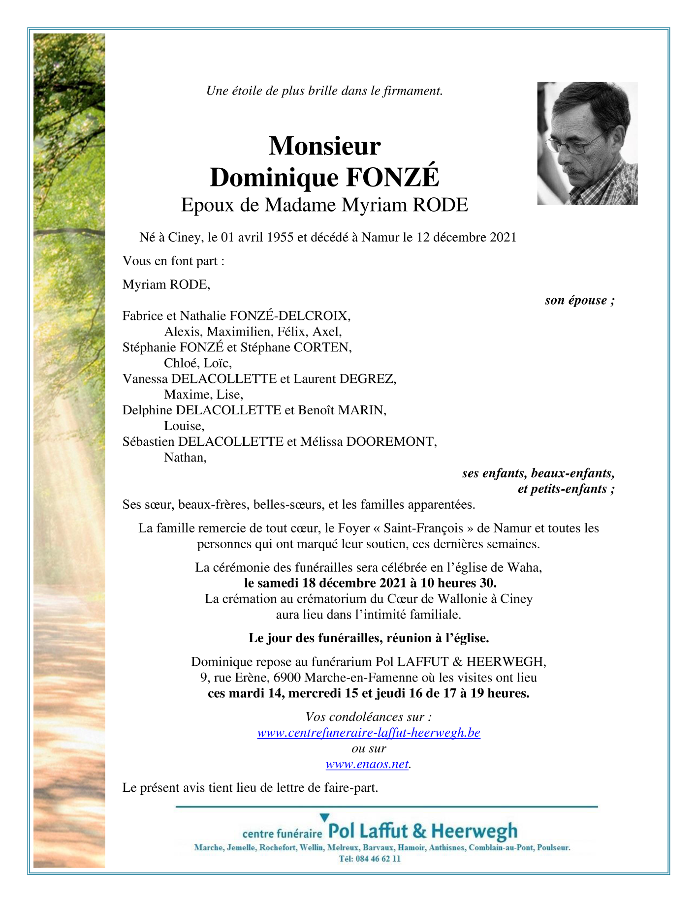 Died in Namur (5000) on 13 December 2021 at the age of 66 years