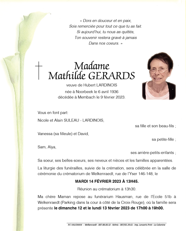 Décédée à Membach (4837) le jeudi 9 février 2023 à l'âge de 86 ans