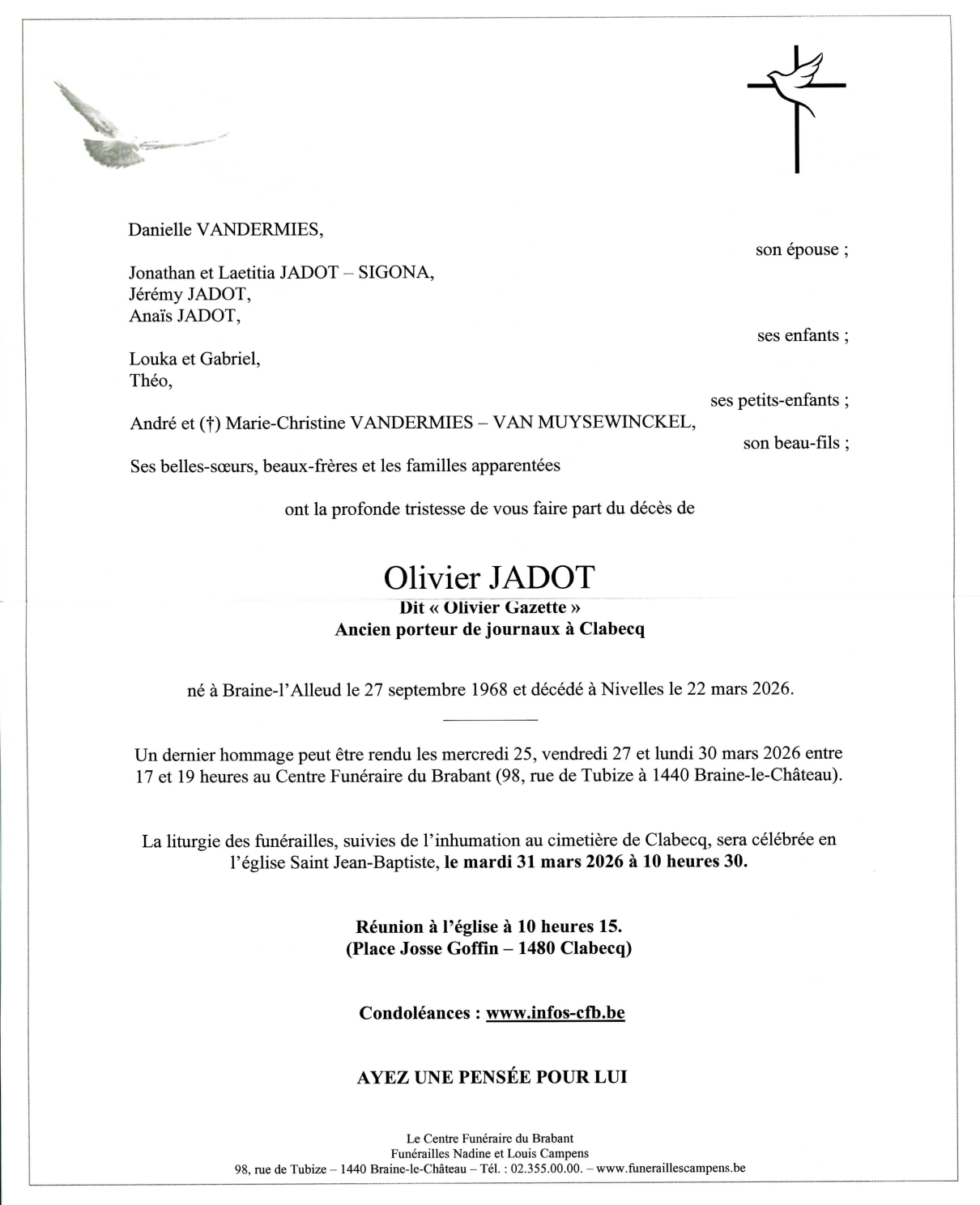 Died in Nivelles (1400) on 22 March 2026 at the age of 57 years