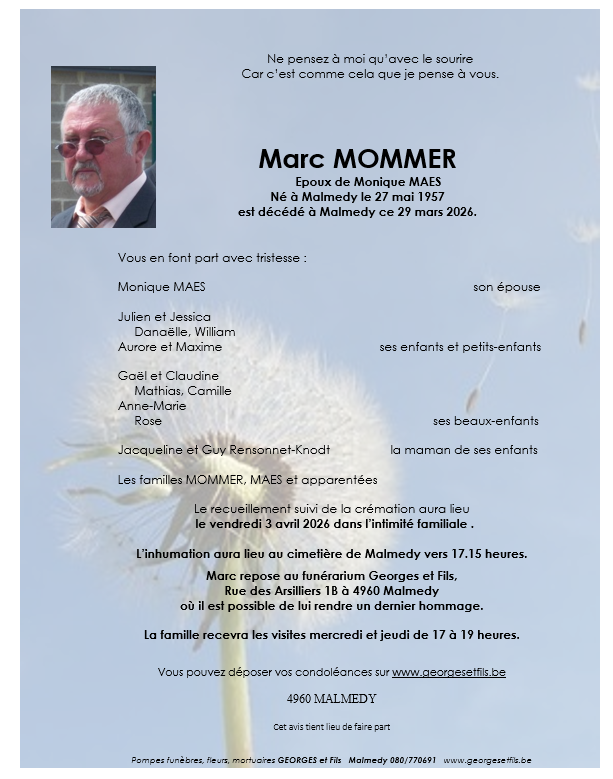 Overleden te Malmedy (4960) op zondag 29 maart 2026 op 68-jarige leeftijd