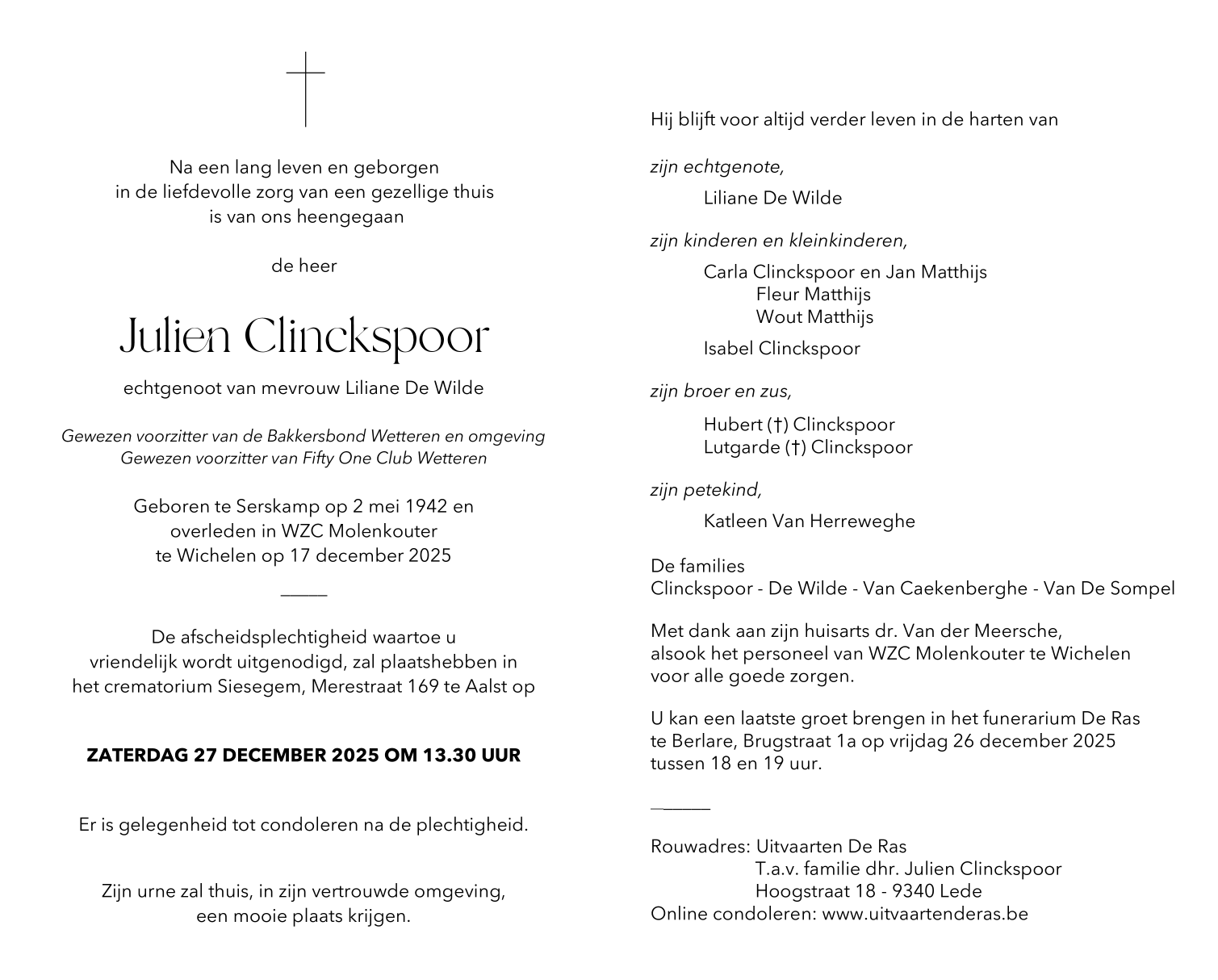 Décédé à Wichelen (9260) le mercredi 17 décembre 2025 à l'âge de 83 ans