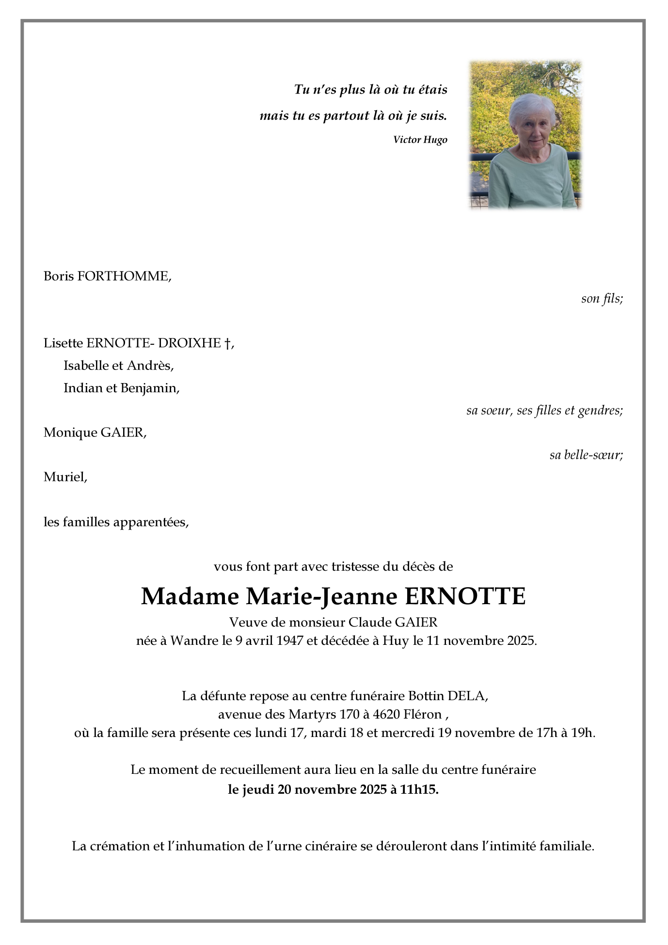 Fallecida en Huy (4500) el martes, 11 de noviembre de 2025 a la edad de 78 años