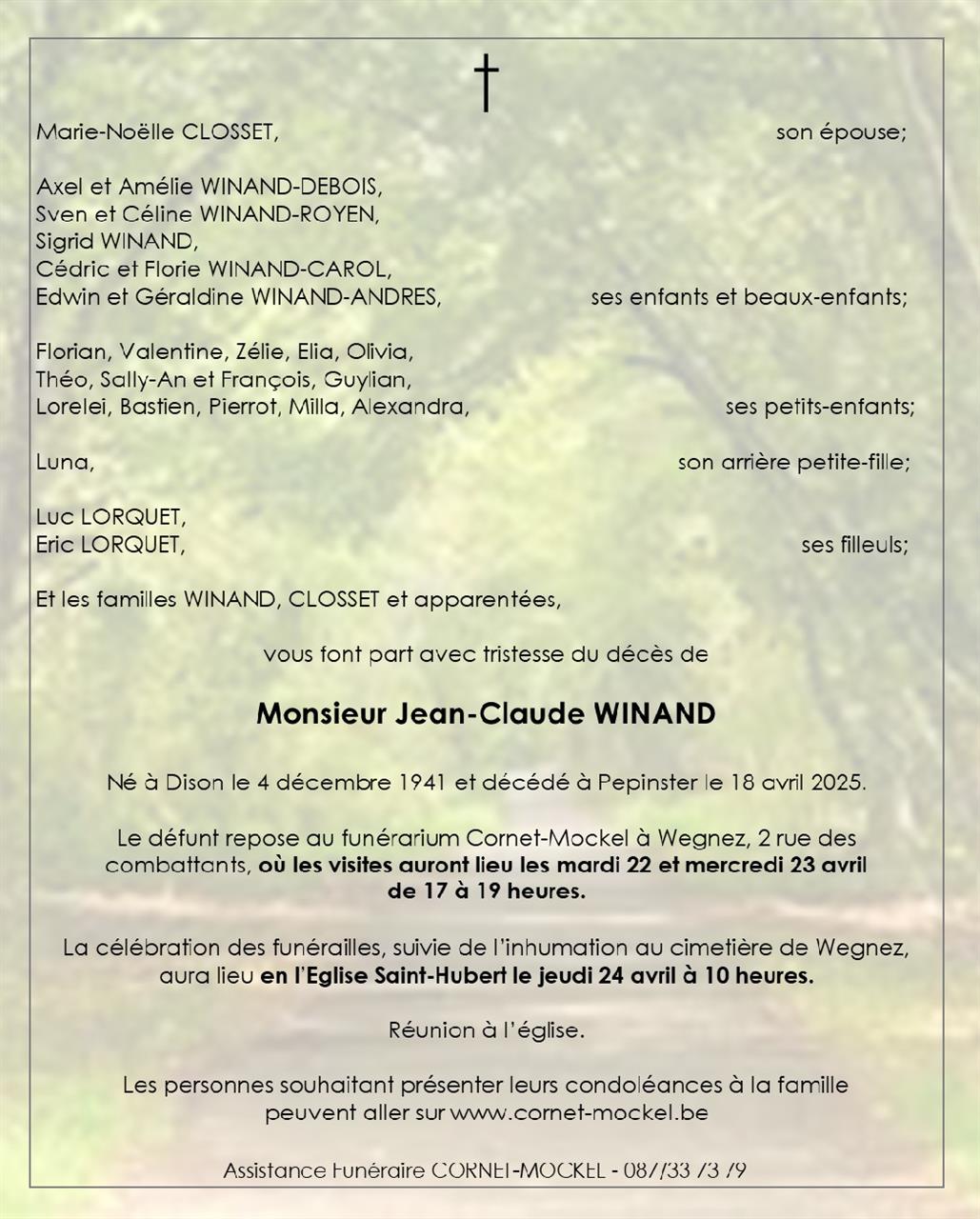 Overleden te Pepinster (4860) op vrijdag 18 april 2025 op 83-jarige leeftijd