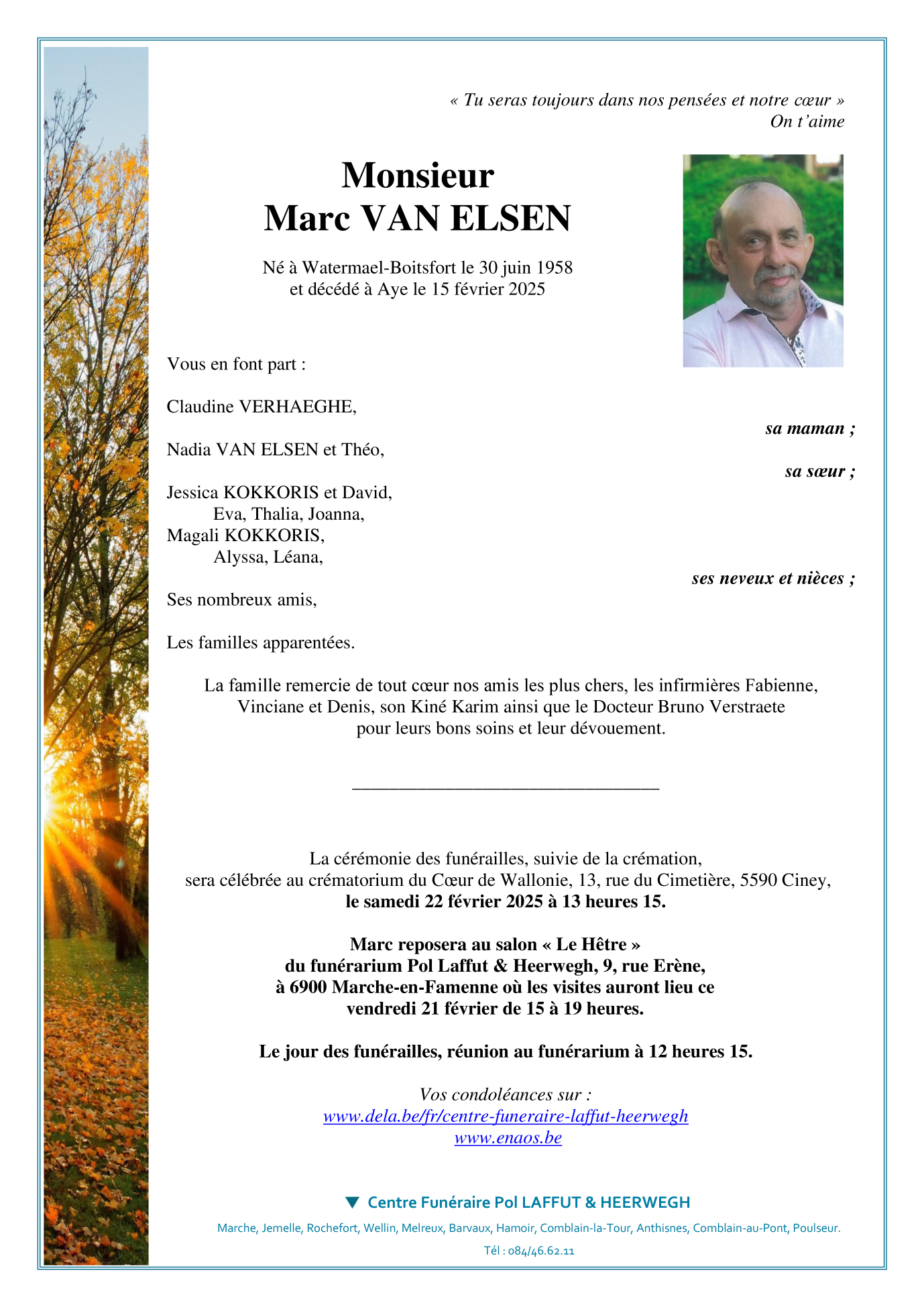 Décédé à Aye (6900) le samedi 15 février 2025 à l'âge de 66 ans