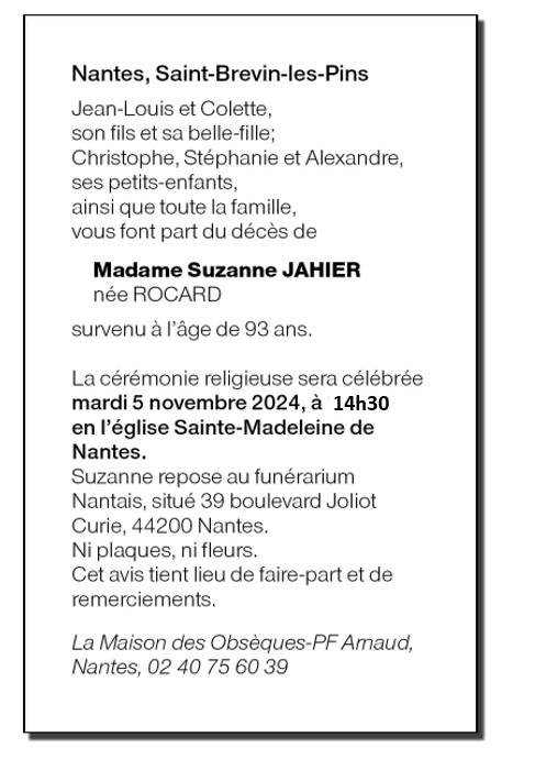 Décédée à Nantes (44300, France) le mardi 29 octobre 2024 à l'âge de 93 ans