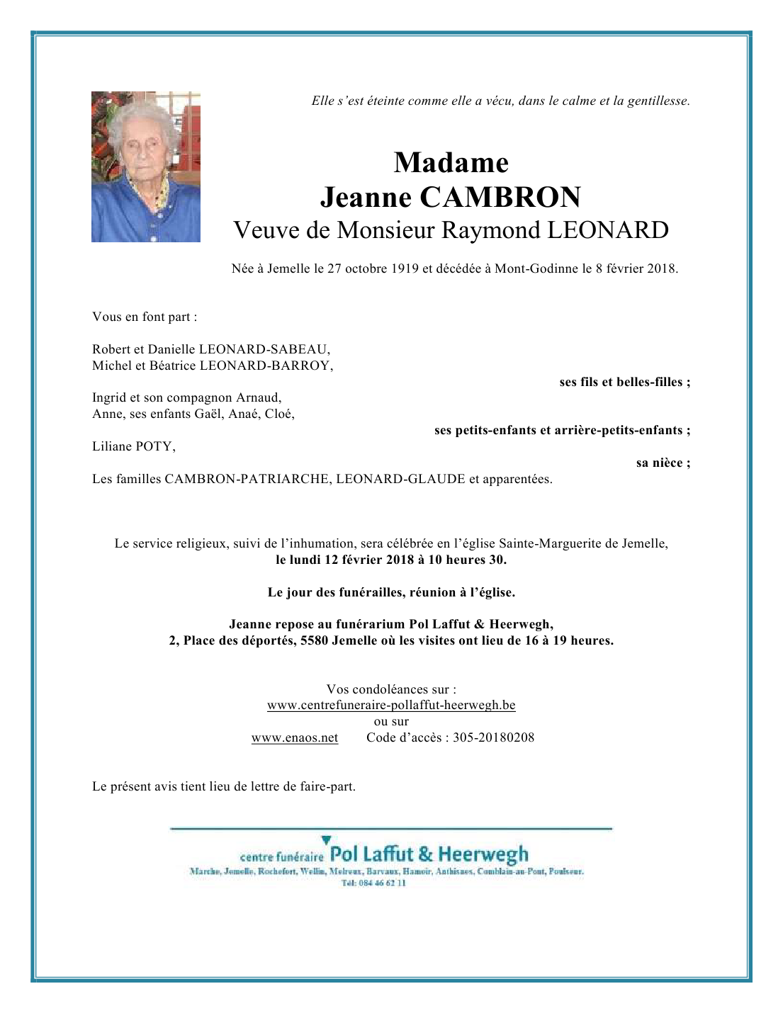 Died in Mont-Godinne (5530) on 08 February 2018 at the age of 98 years