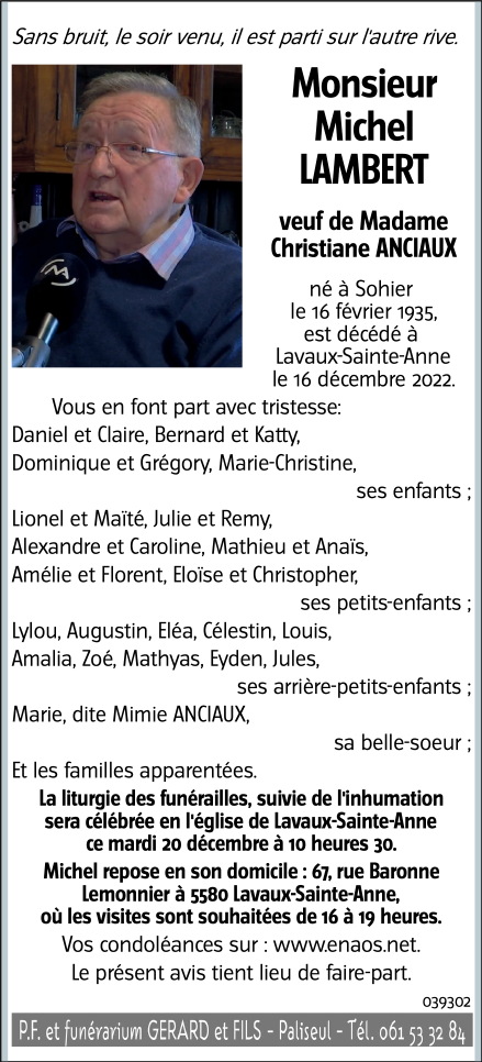 Died in Lavaux-Sainte-Anne (5580) on 16 December 2022 at the age of 87 years