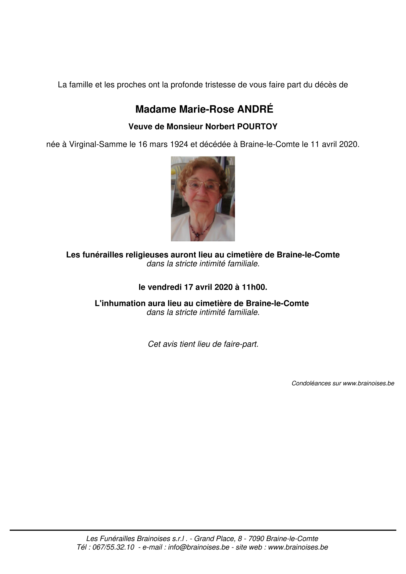 Fallecida en Braine-le-Comte (7090) el sábado, 11 de abril de 2020 a la edad de 96 años