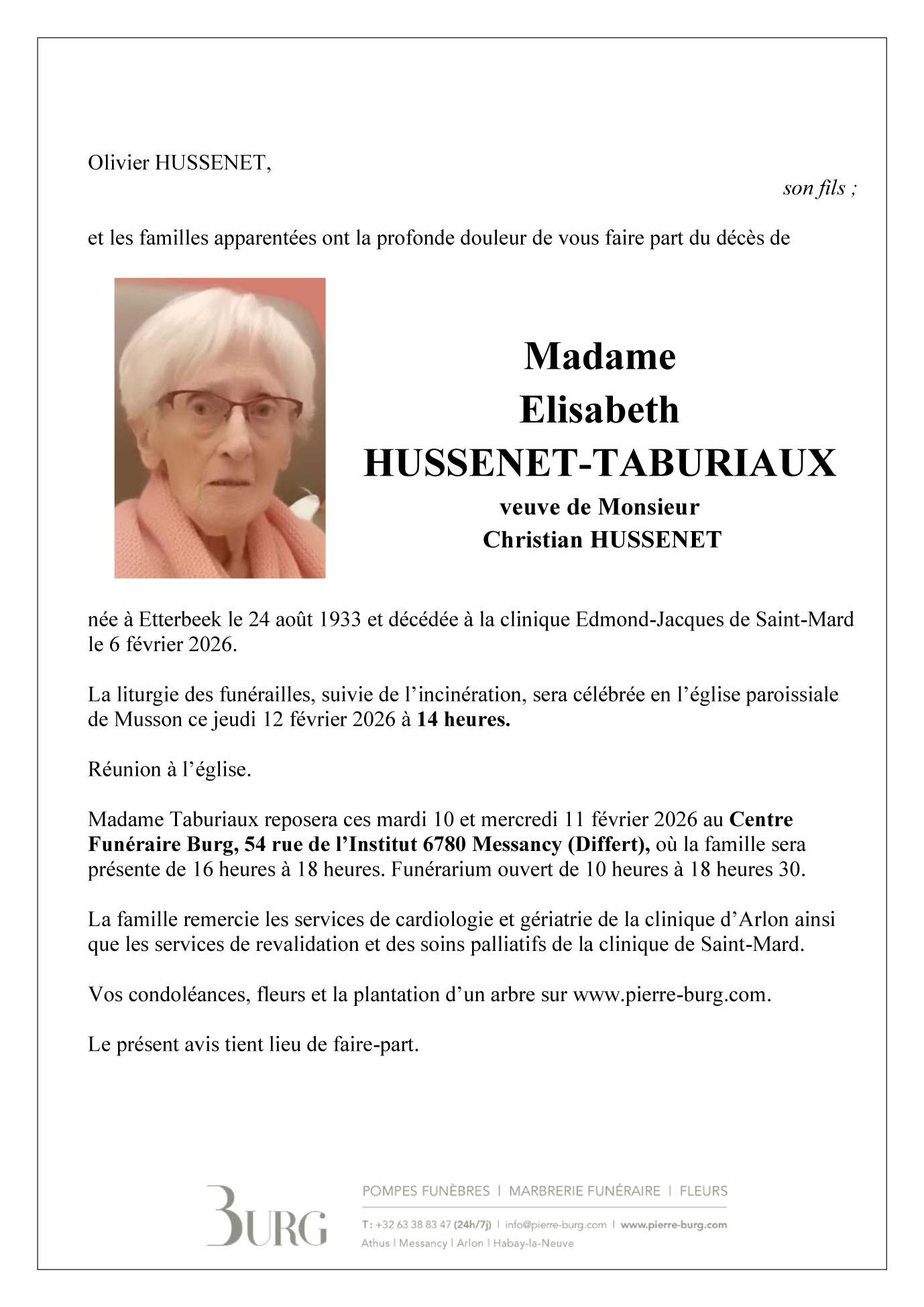 Décédée à Saint-Mard (6762) le vendredi 6 février 2026 à l'âge de 92 ans