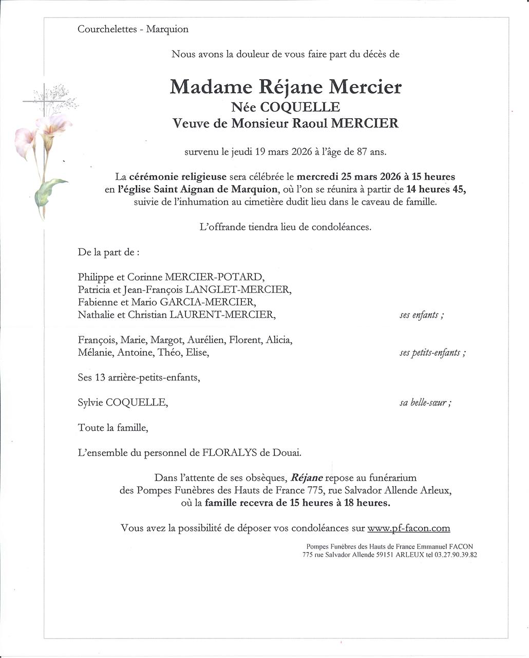 Madame Réjane MERCIER née COQUELLE