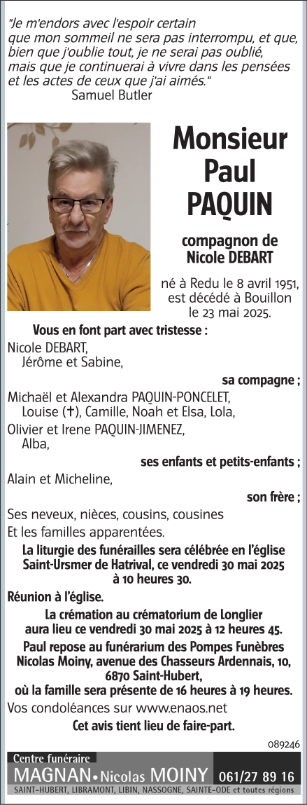 Décédé à Bouillon (6830) le lundi 26 mai 2025 à l'âge de 74 ans