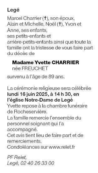Décédée à La Roche-sur-Yon (85000, France) le jeudi 12 juin 2025 à l'âge de 89 ans