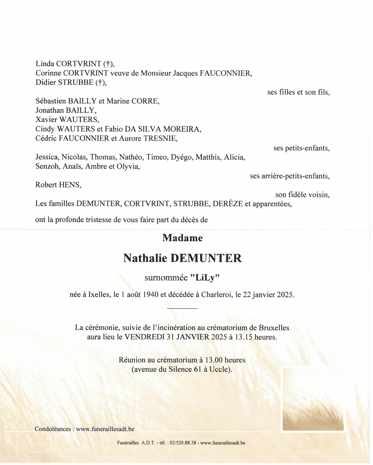 Décédée à Charleroi (6000) le mercredi 22 janvier 2025 à l'âge de 84 ans