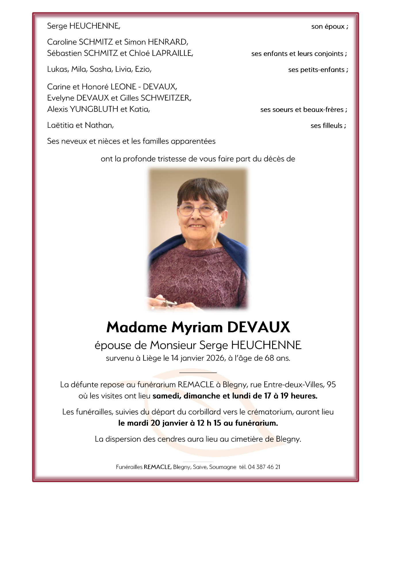 Décédée à Liège (4000) le mercredi 14 janvier 2026 à l'âge de 68 ans
