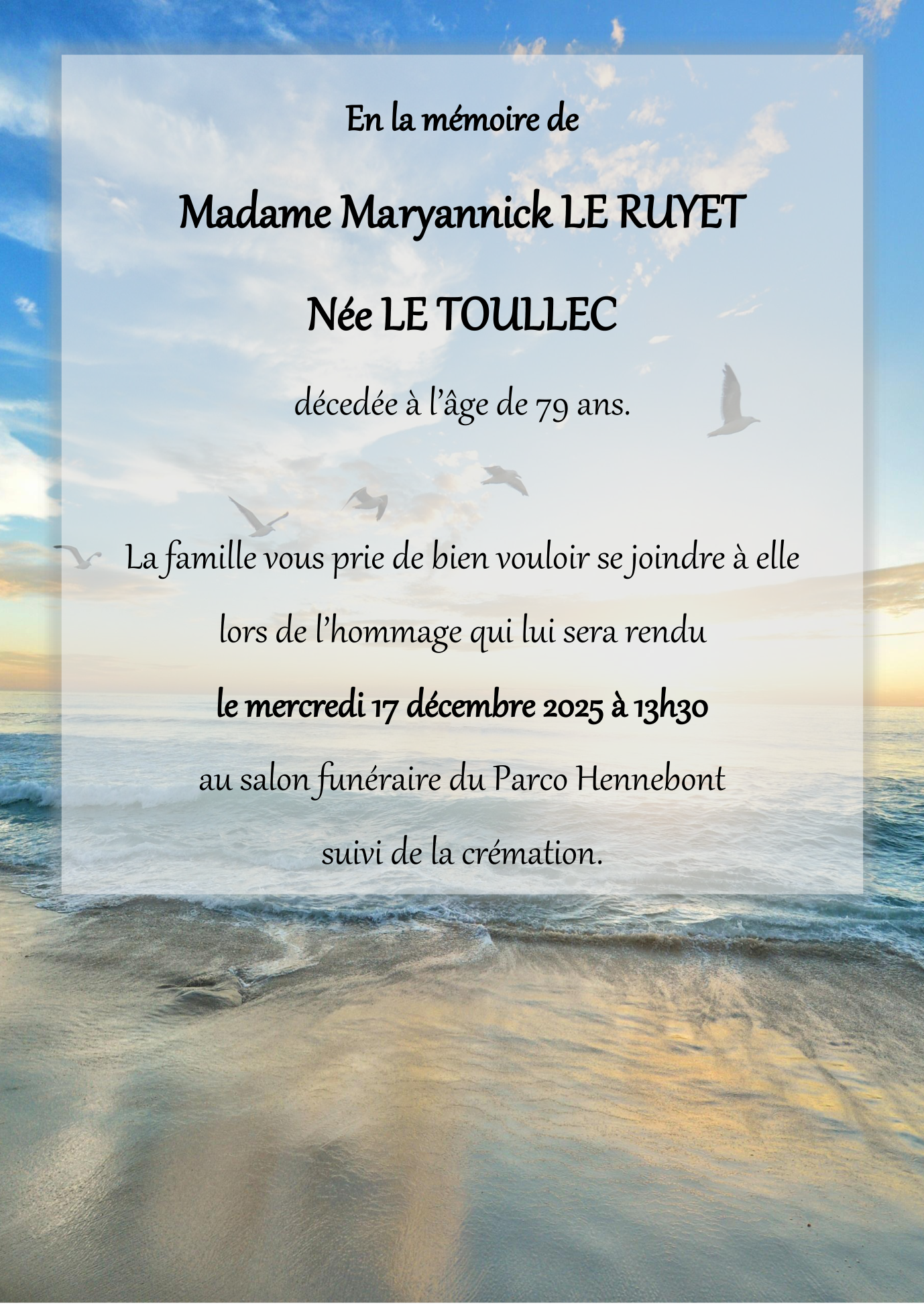 Décédée à Lorient (56100, France) le samedi 13 décembre 2025 à l'âge de 79 ans