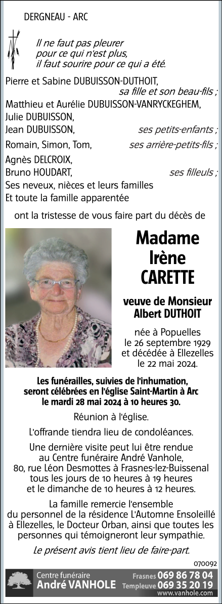 Widow of Monsieur Albert DUTHOIT