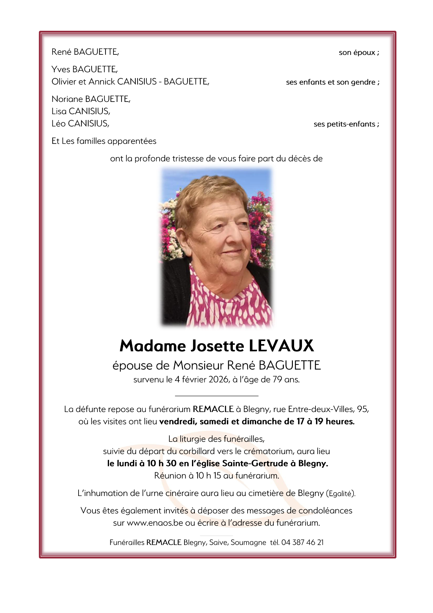 Décédée à Herstal (4040) le mercredi 4 février 2026 à l'âge de 79 ans
