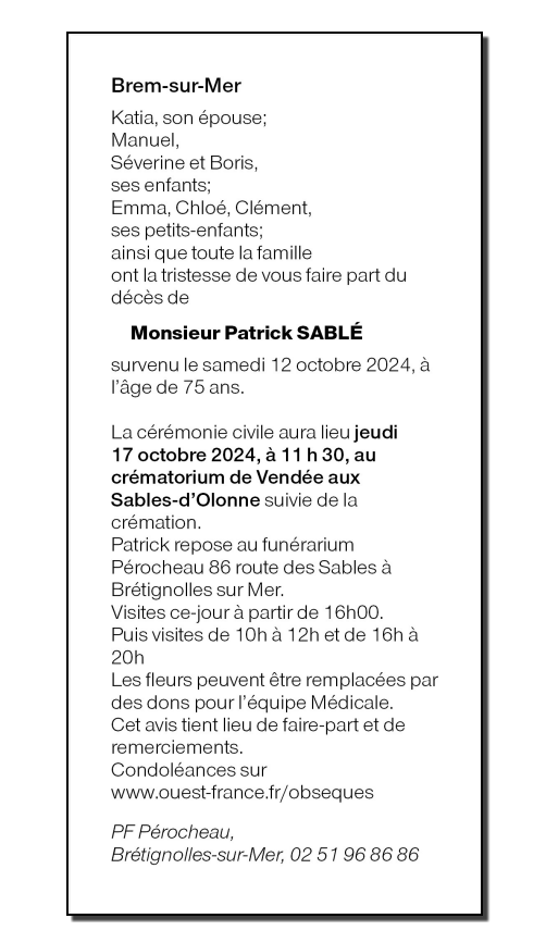 Décédé à Brem-sur-Mer (85470, France) le samedi 12 octobre 2024 à l'âge de 75 ans