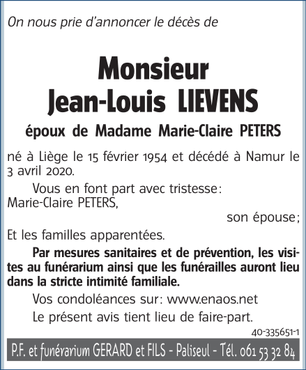 Décédé à Namur (5000) le vendredi 3 avril 2020 à l'âge de 66 ans