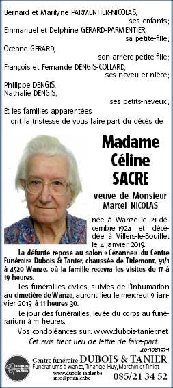 Overleden te Villers-le-Bouillet (4530) op vrijdag 4 januari 2019 op 94-jarige leeftijd
