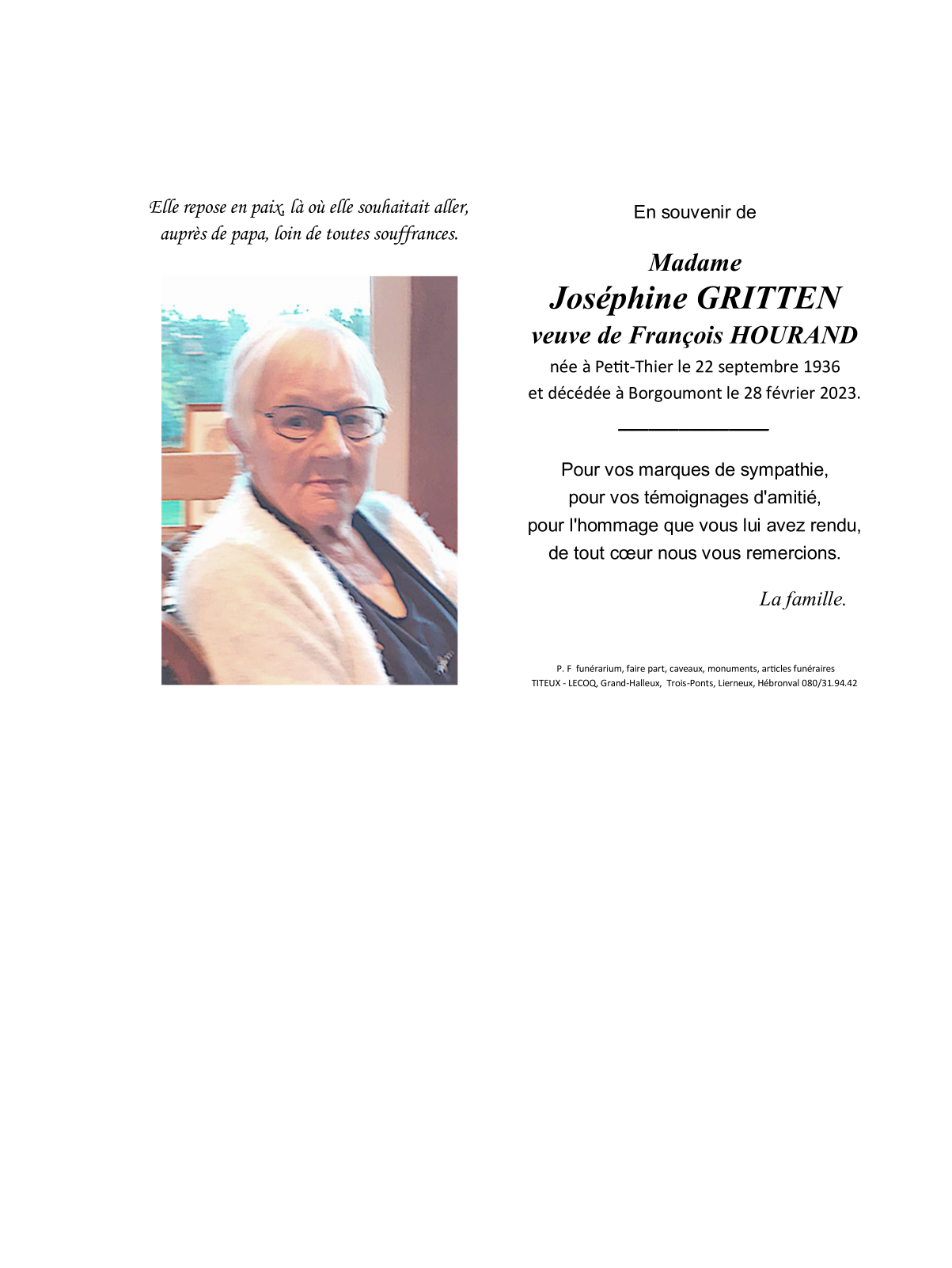 Décédée à Borgoumont (4987) le mardi 28 février 2023 à l'âge de 86 ans