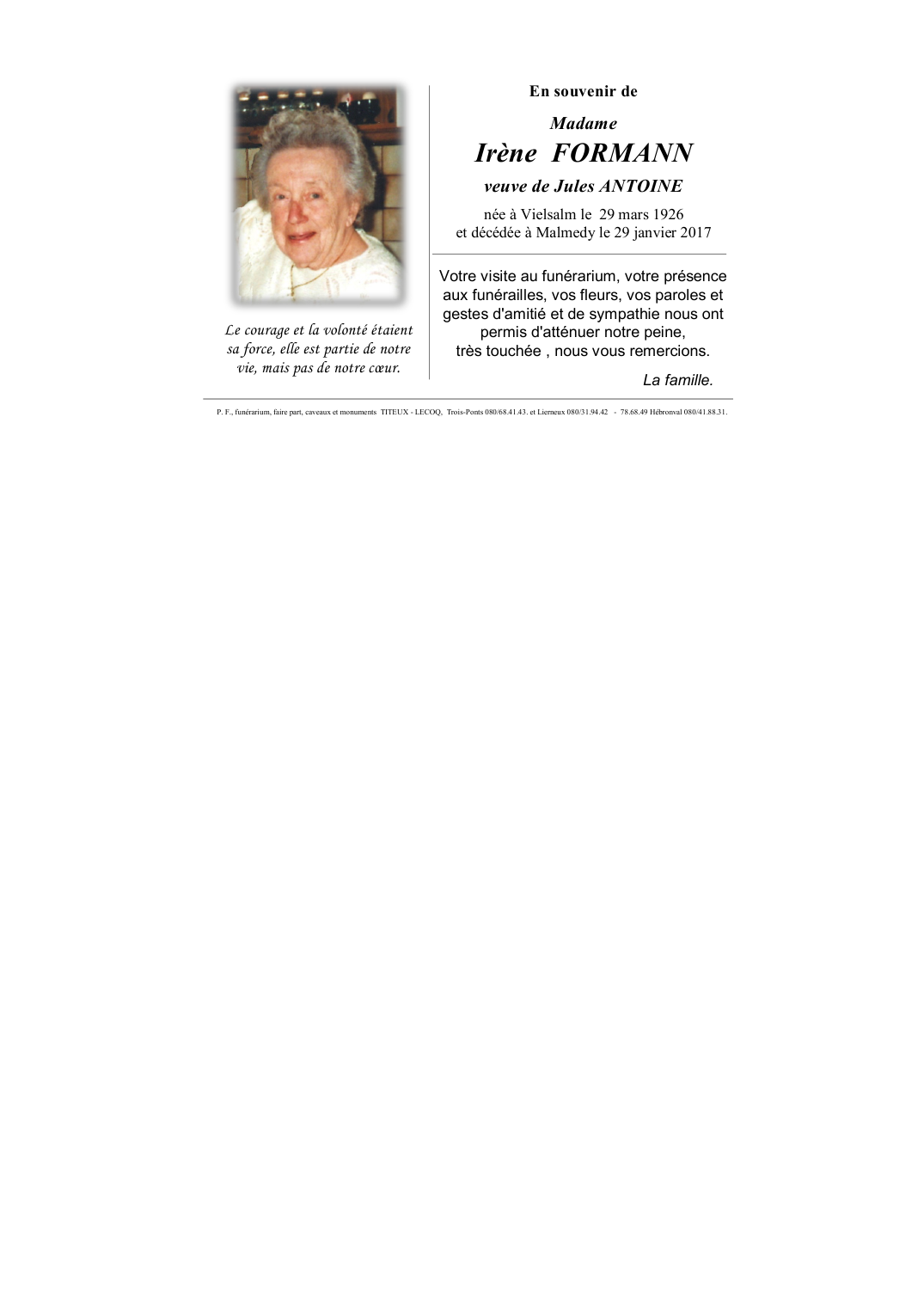 Fallecida en Malmedy (4960) el domingo, 29 de enero de 2017 a la edad de 90 años