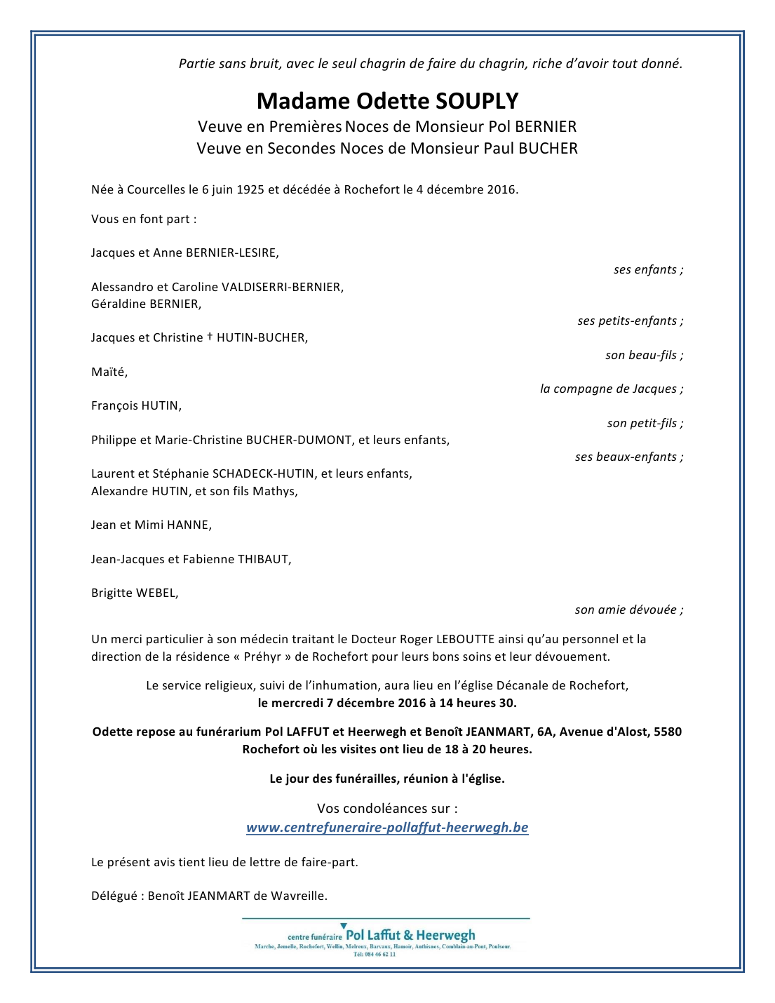 Died in Rochefort (5580) on 05 December 2016 at the age of 91 years