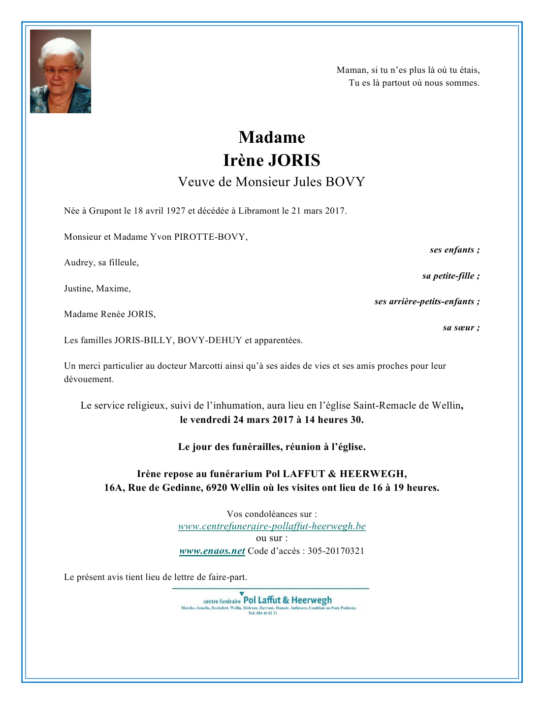 Décédée à Libramont (6800) le mardi 21 mars 2017 à l'âge de 89 ans