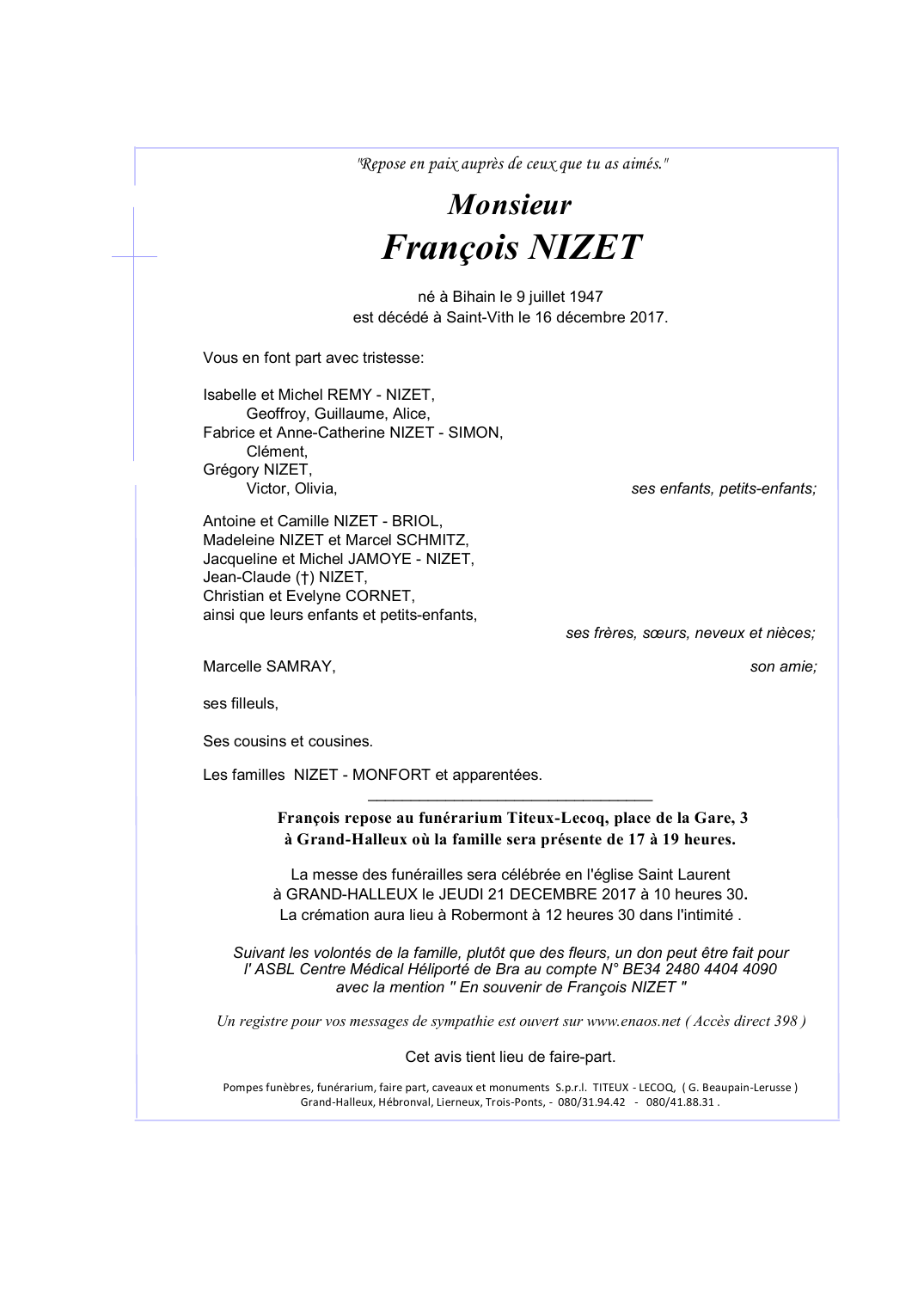 Overleden te Saint-Vith (4780) op zaterdag 16 december 2017 op 70-jarige leeftijd