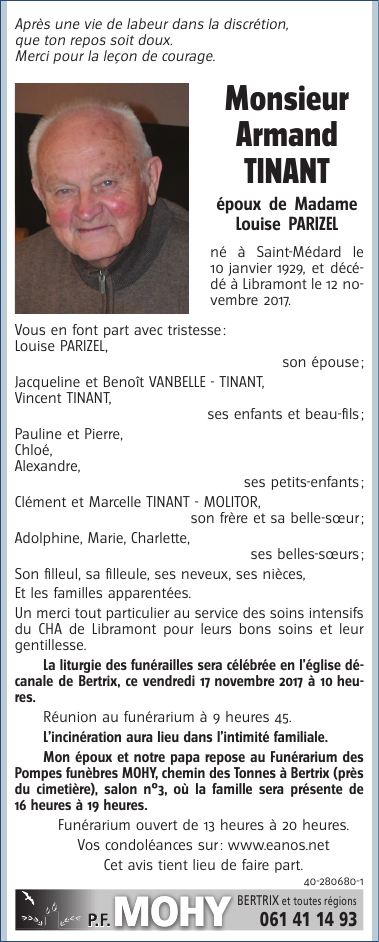 Décédé à Libramont (6800) le dimanche 12 novembre 2017 à l'âge de 88 ans
