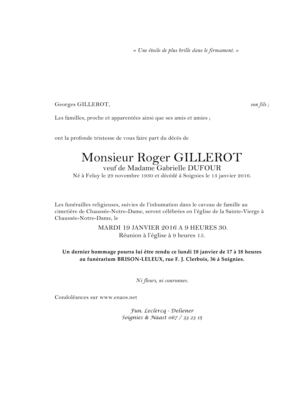 Fallecido en Soignies (7060) el miércoles, 13 de enero de 2016 a la edad de 85 años