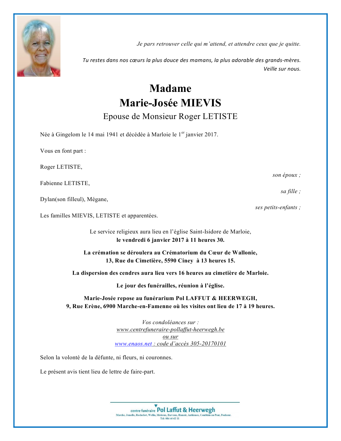 Décédée à Marloie (6900) le dimanche 1 janvier 2017 à l'âge de 75 ans