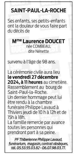 Décédée à Thiviers (24800, France) le mardi 24 décembre 2024 à l'âge de 98 ans