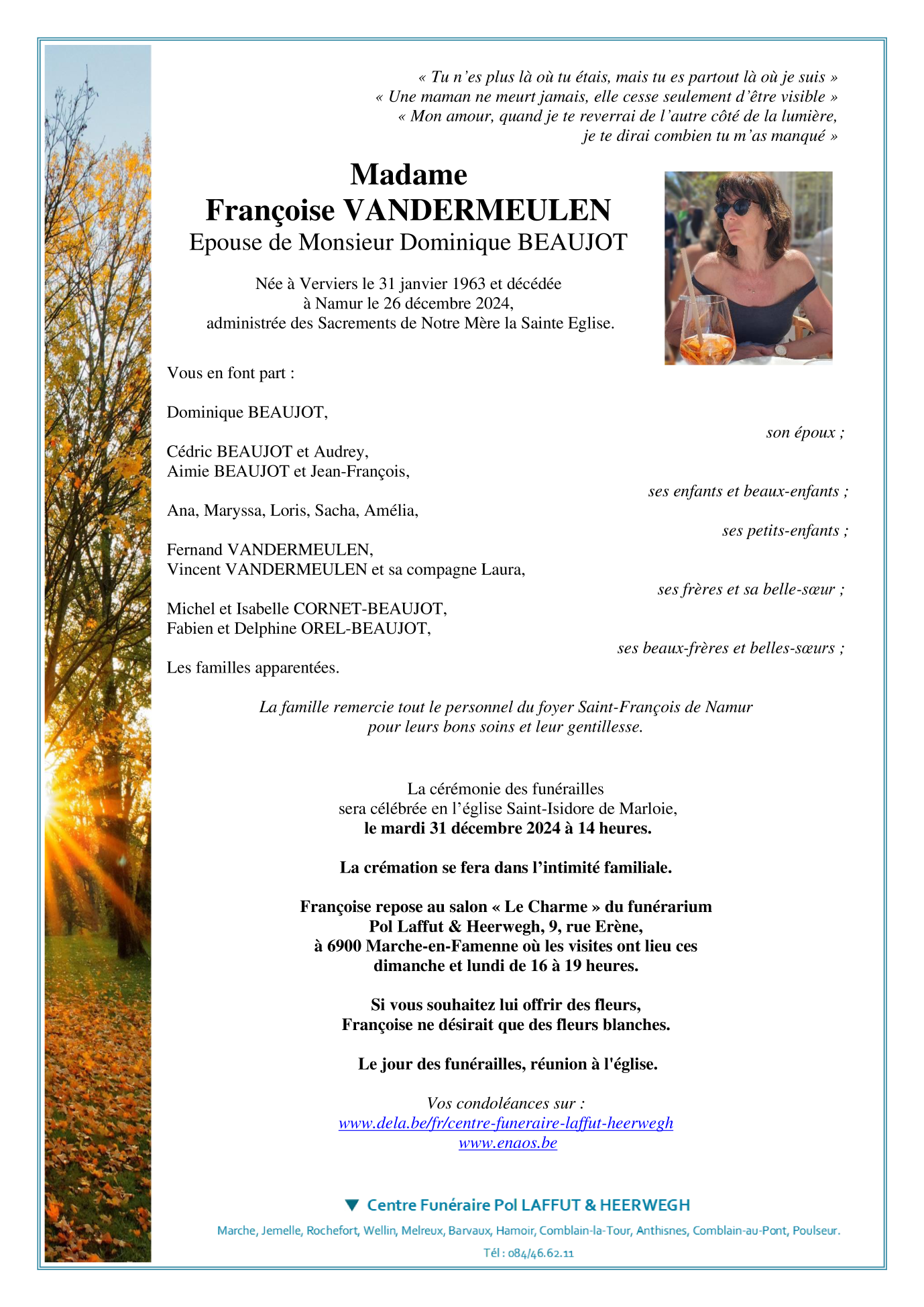 Décédée à Namur (5000) le jeudi 26 décembre 2024 à l'âge de 61 ans