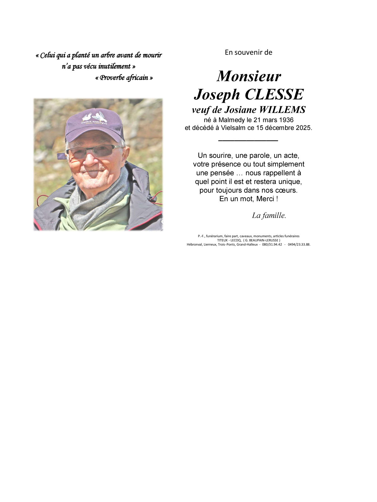 Décédé à Vielsalm (6690) le lundi 15 décembre 2025 à l'âge de 89 ans