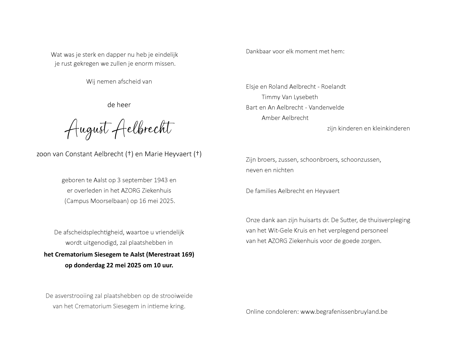 Overleden te Aalst (9300) op vrijdag 16 mei 2025 op 81-jarige leeftijd