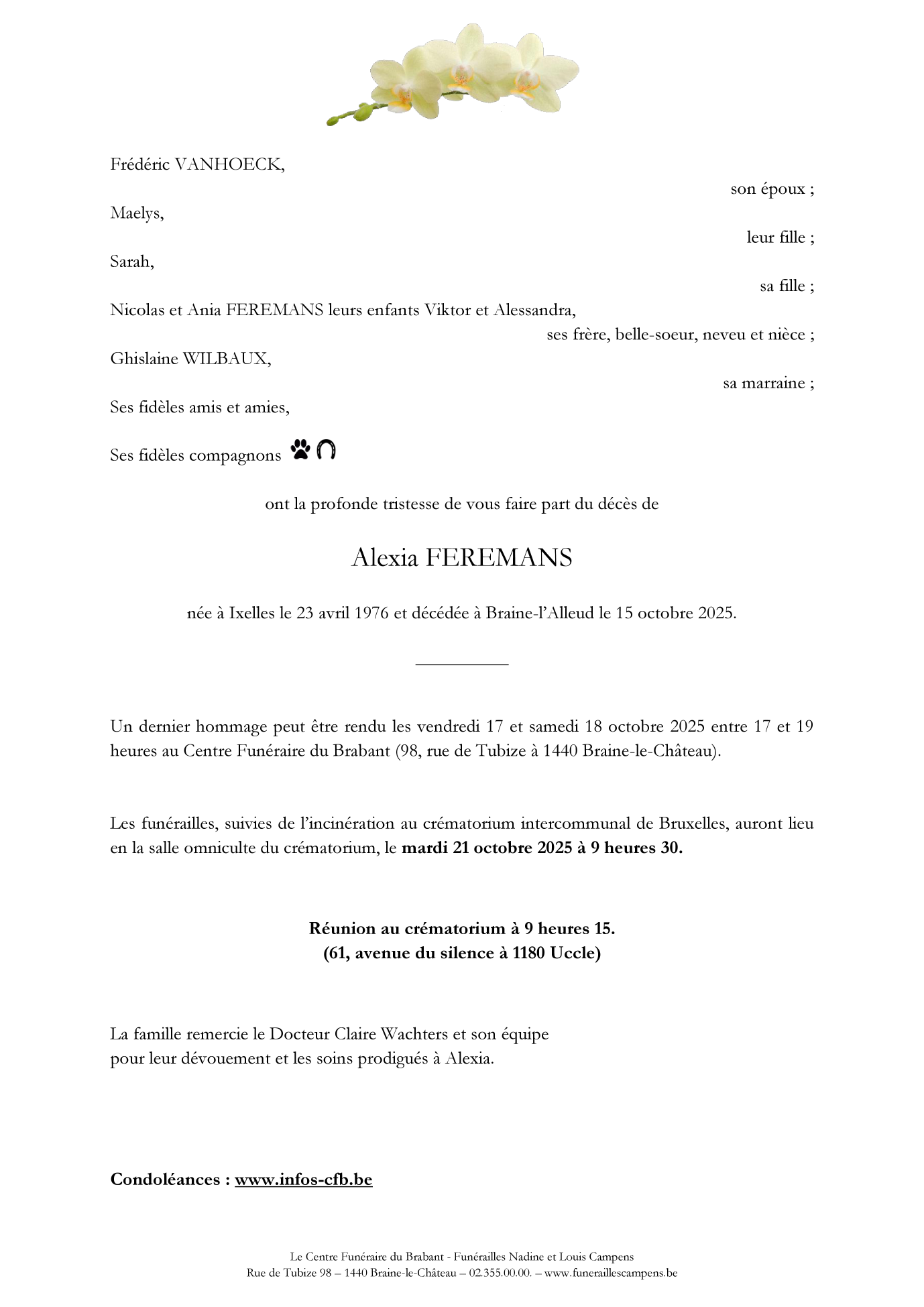 Décédée à Braine-l'Alleud (1420) le mercredi 15 octobre 2025 à l'âge de 49 ans