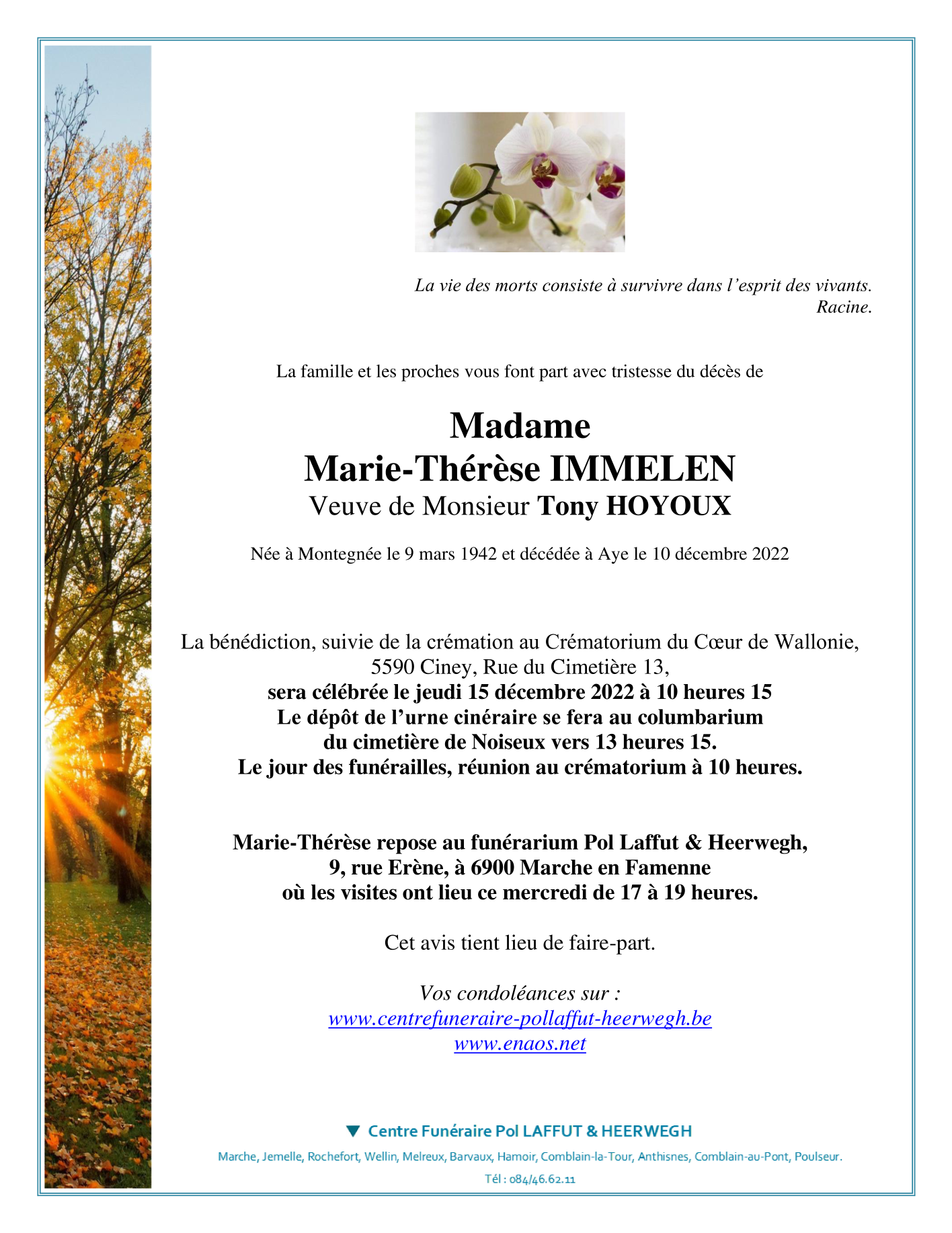 Veuve de Monsieur Tony HOYOUX