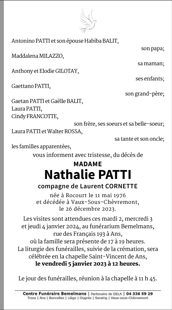 Décédée à Vaux-sous-Chèvremont (4051) le mardi 26 décembre 2023 à l'âge de 47 ans