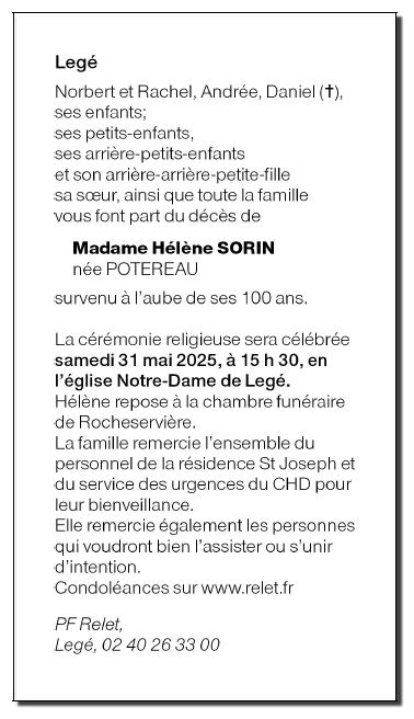 Née à Legé (44650, France) le lundi 1 juin 1925