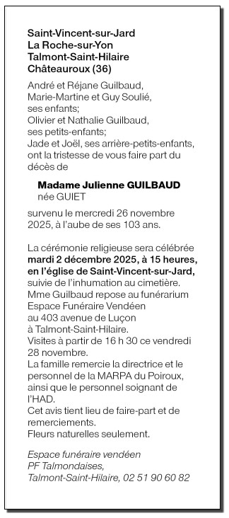 Décédée à Poiroux (85440, France) le mercredi 26 novembre 2025 à l'âge de 102 ans